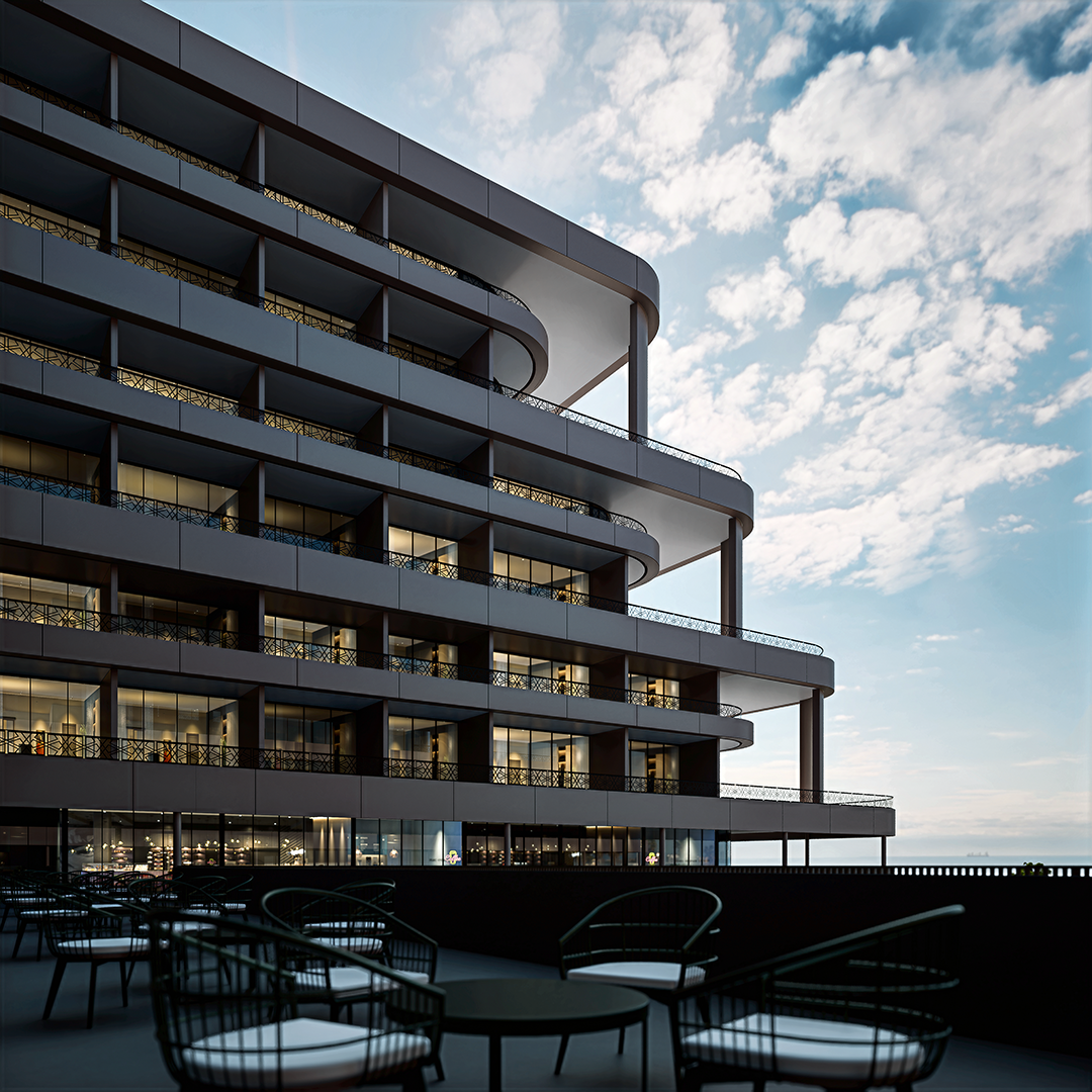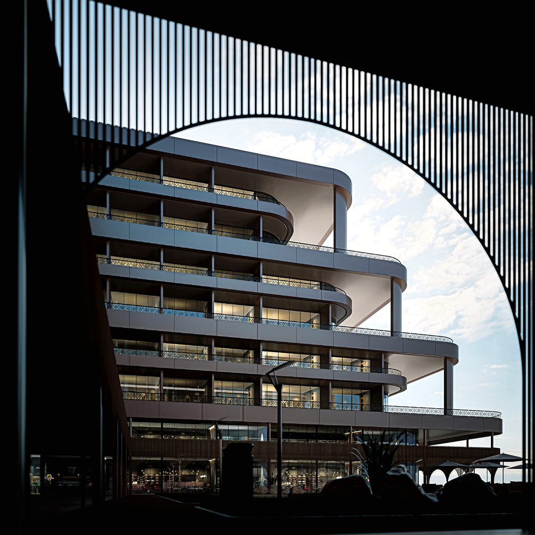 The courtyard features elegant arches and materials that reflect the natural stone tones of the region, while the terrace includes wrought iron details inspired by local heritage.