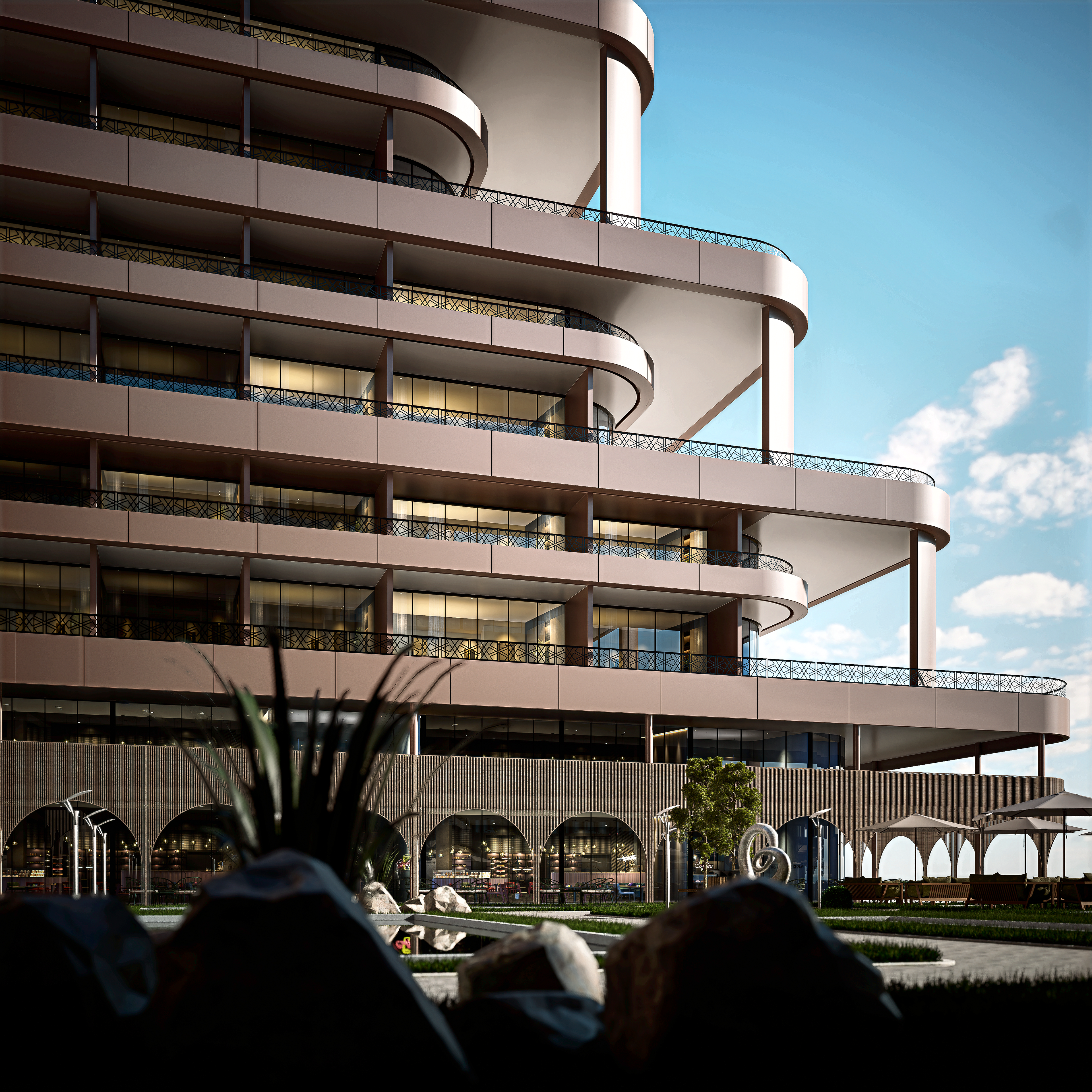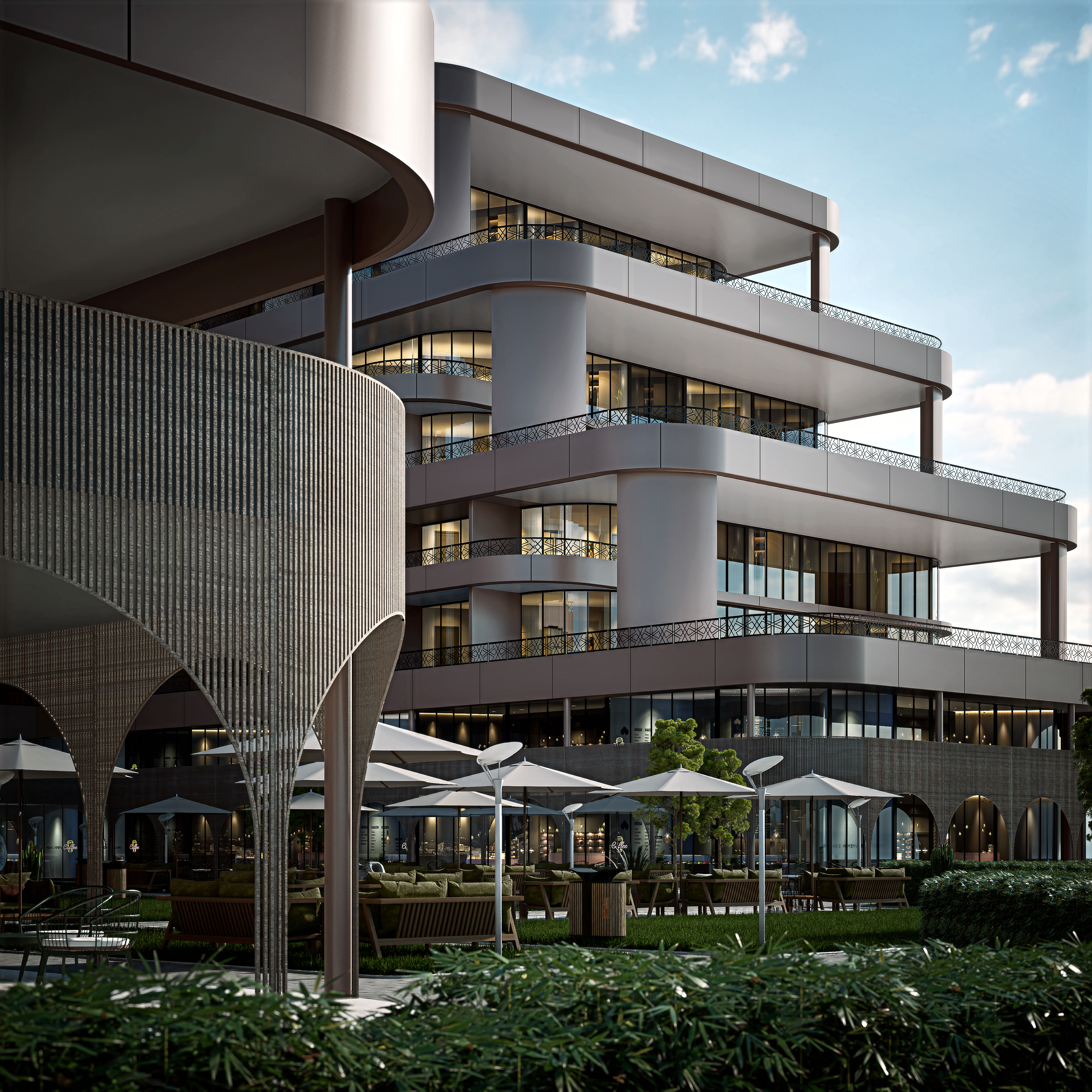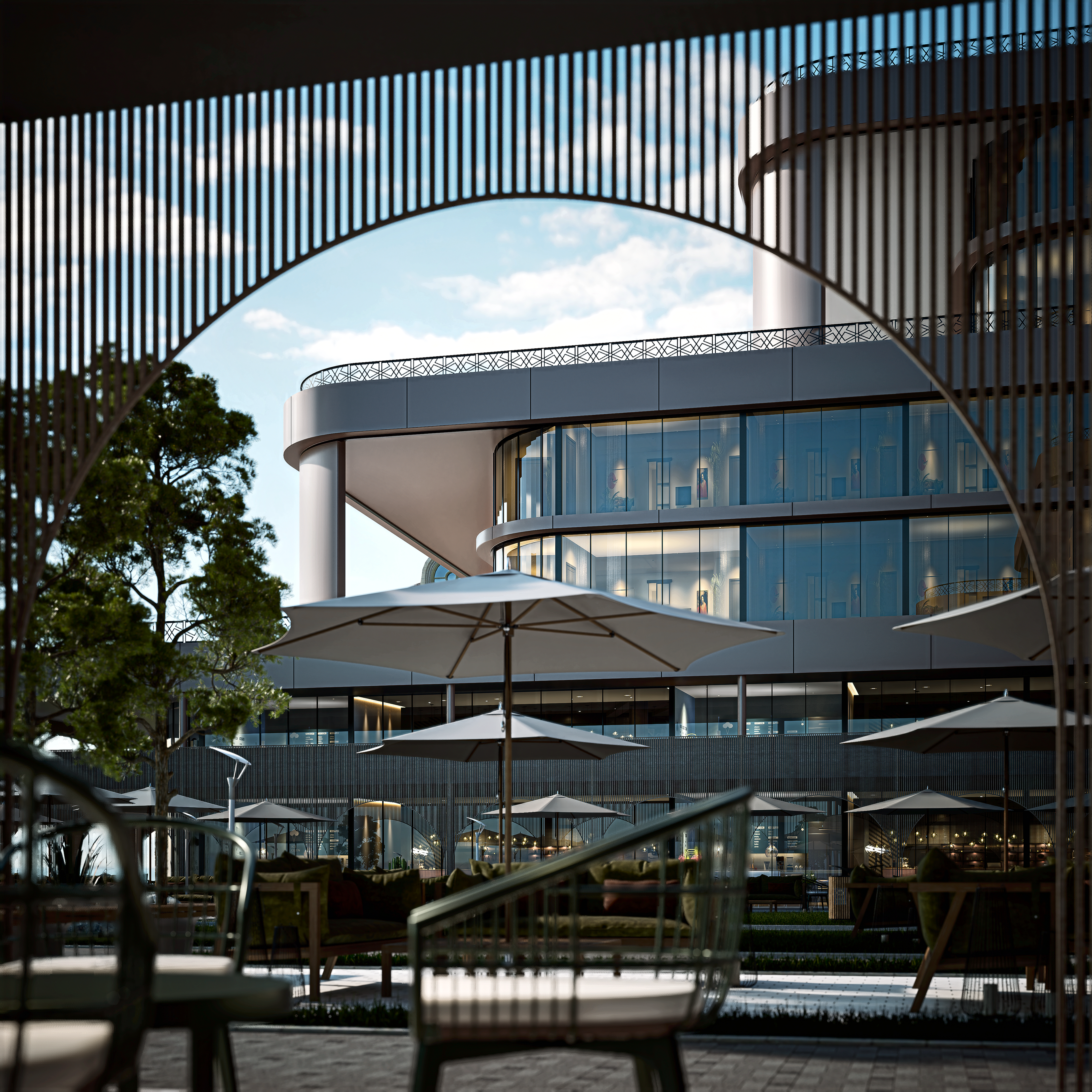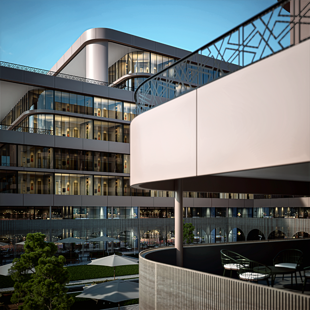 The ground floor offers a peaceful atmosphere with green spaces, cafés, restaurants, and shops.