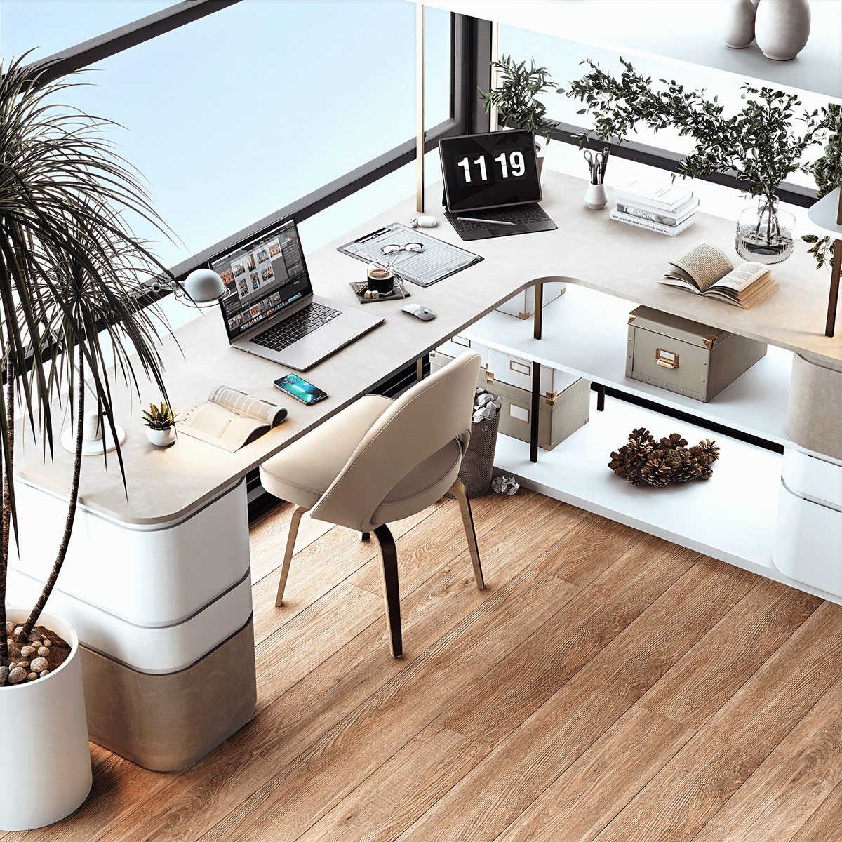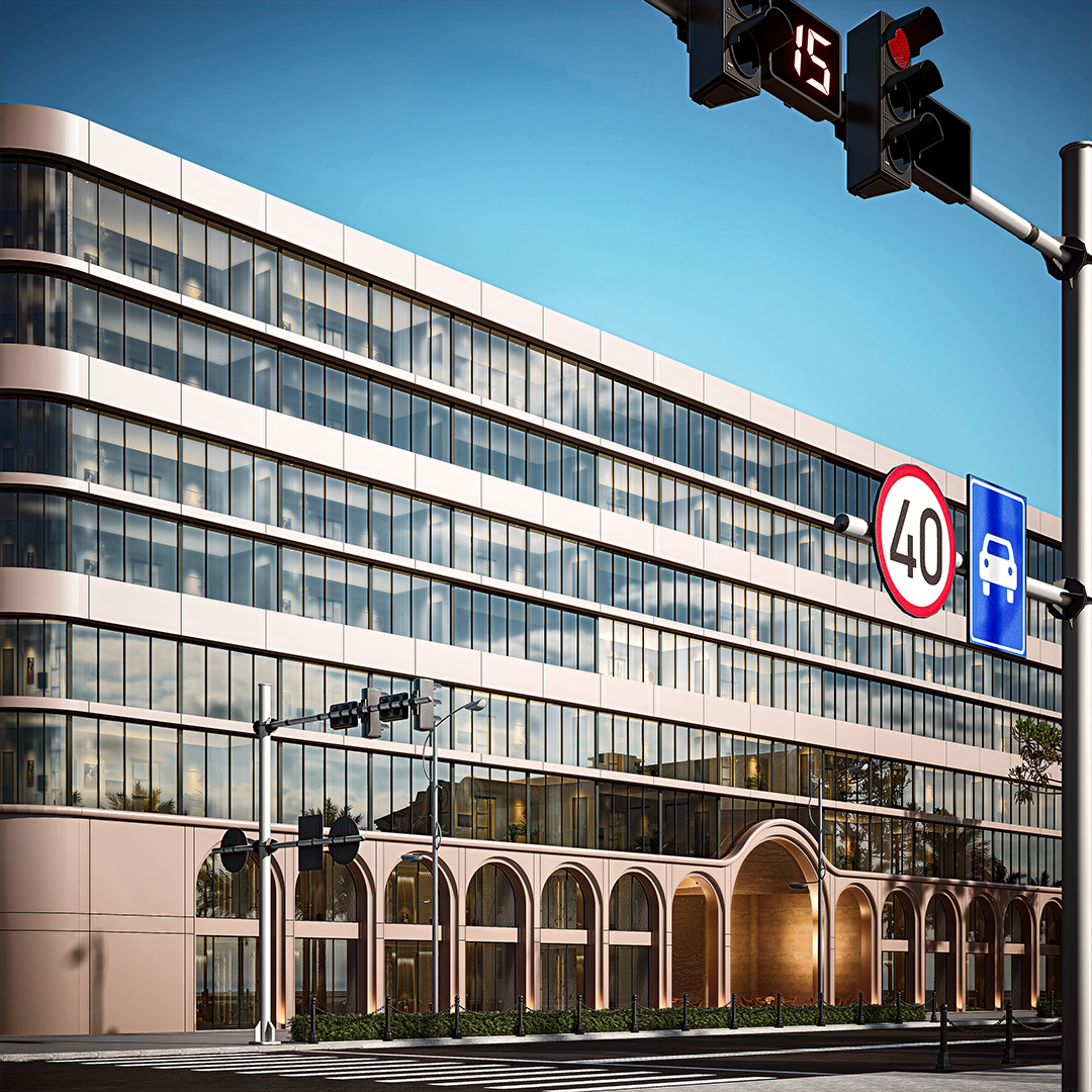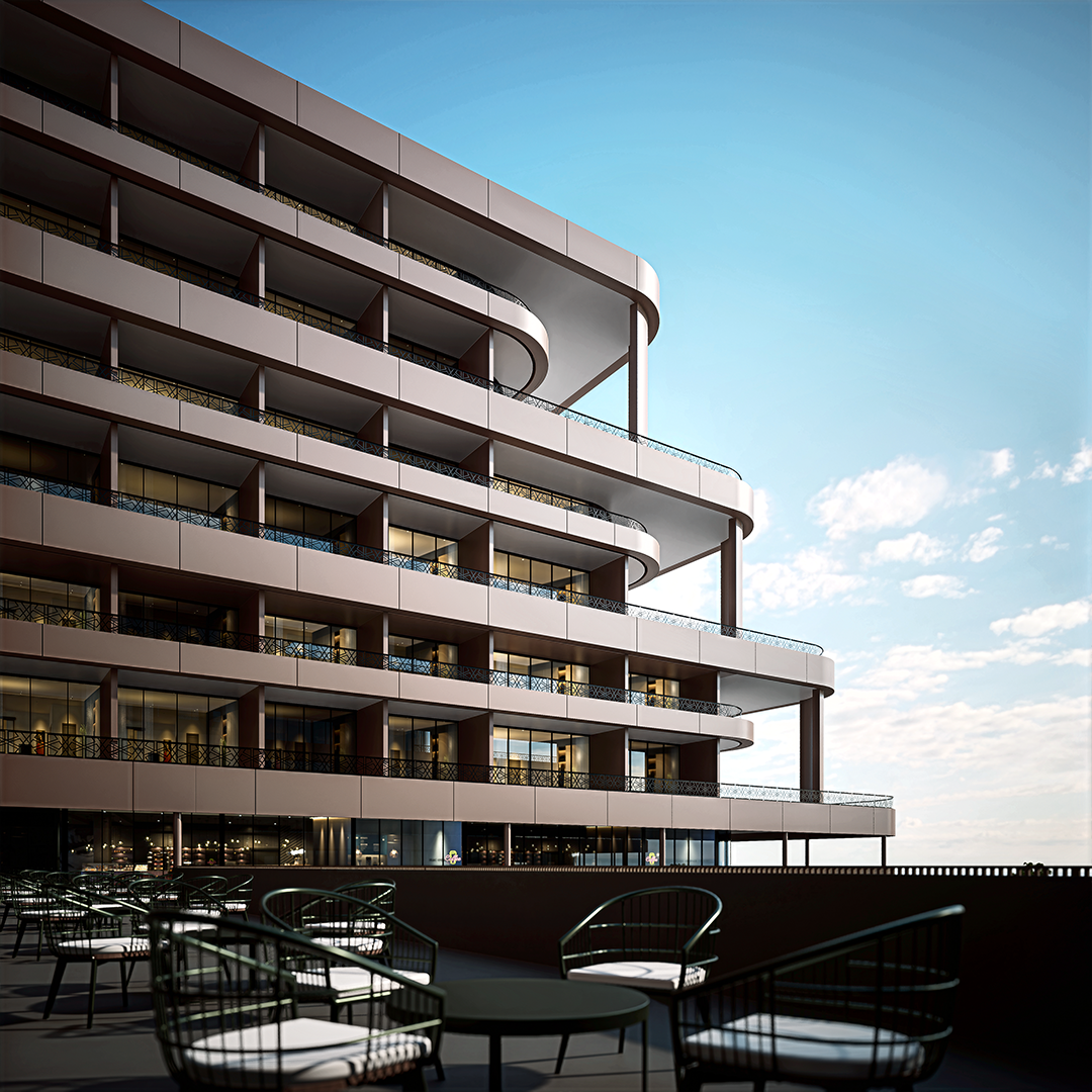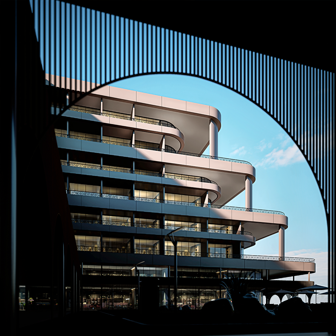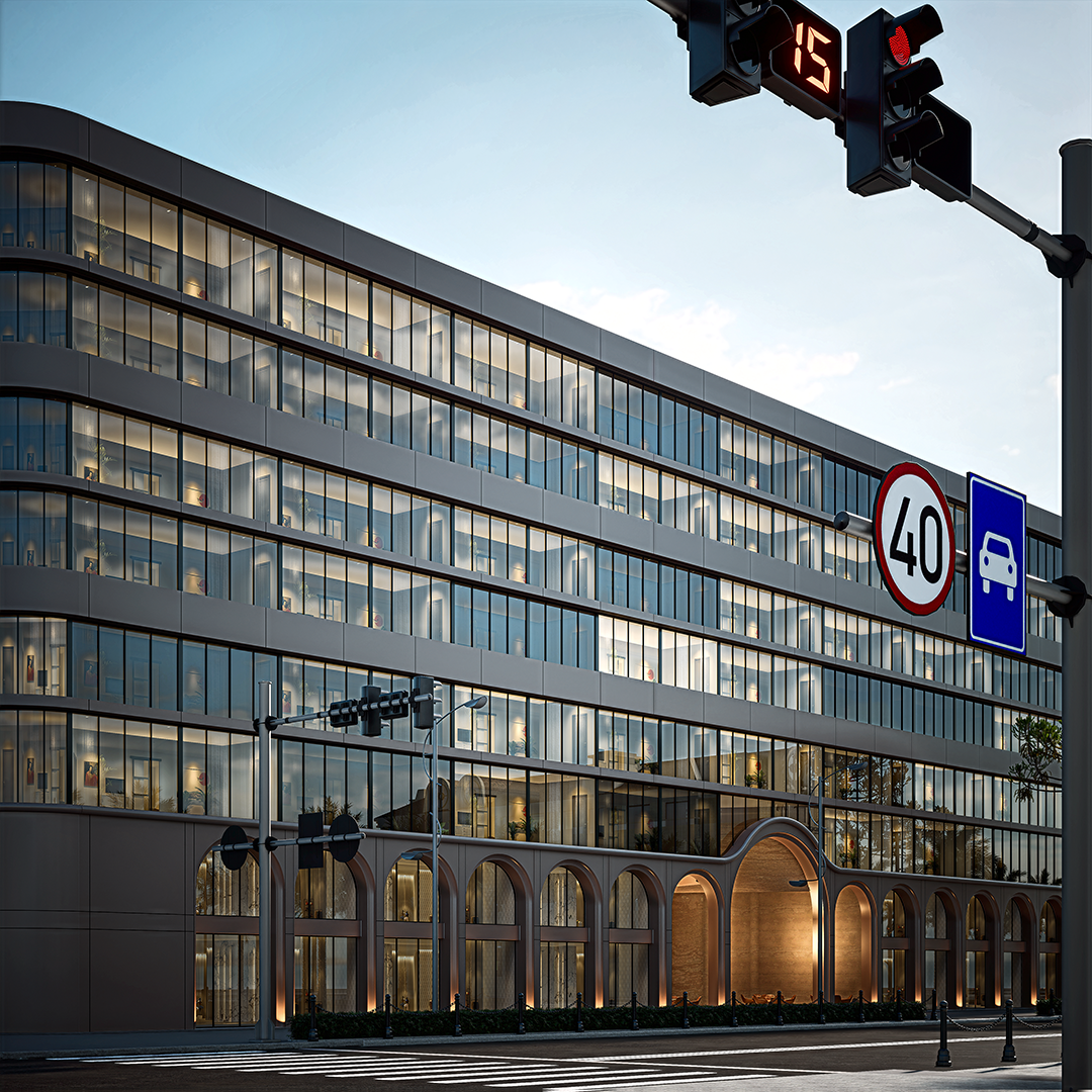 The ground floor offers a peaceful atmosphere with green spaces, cafés, restaurants, and shops.
