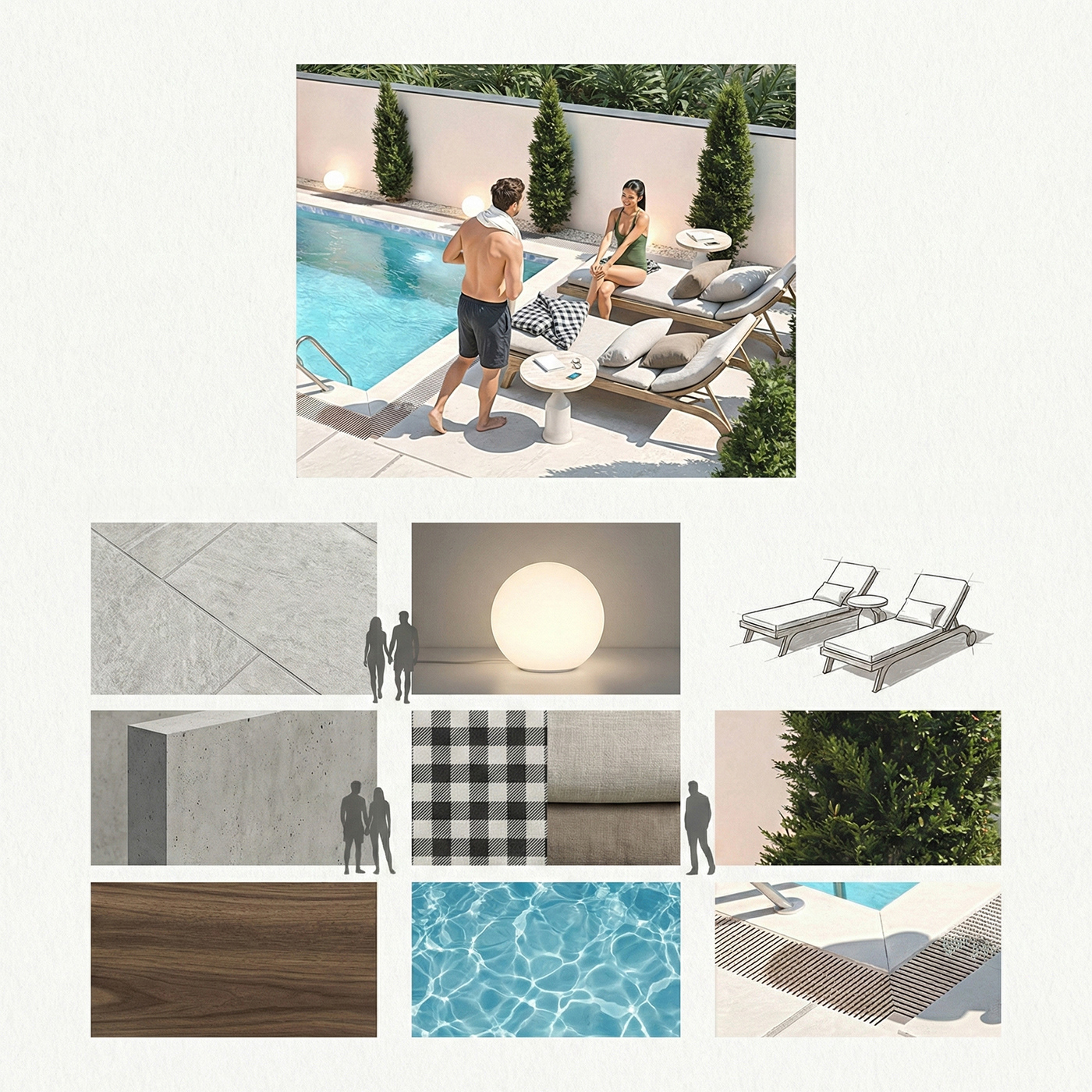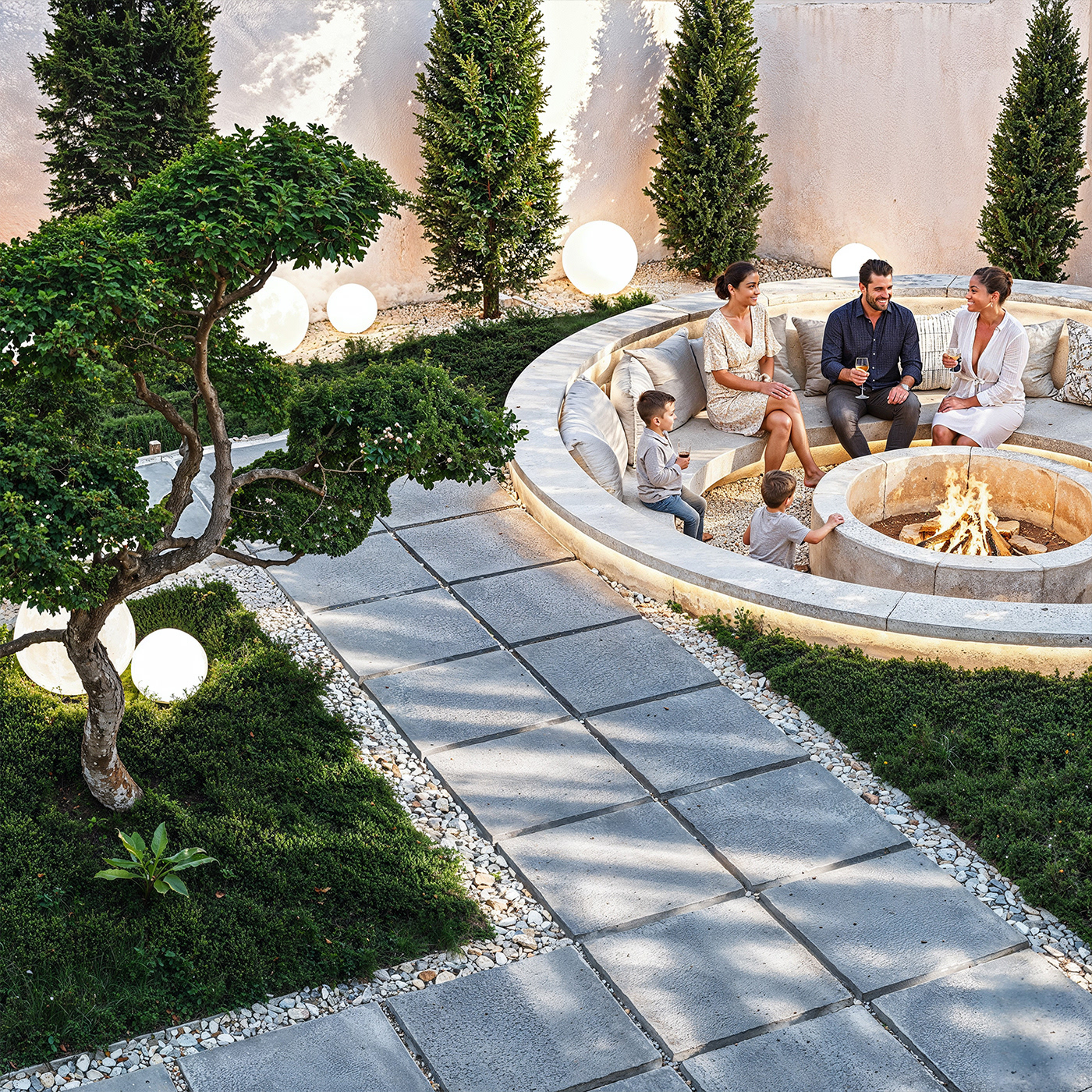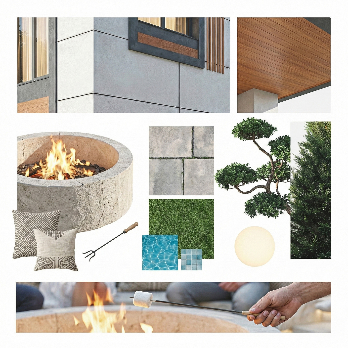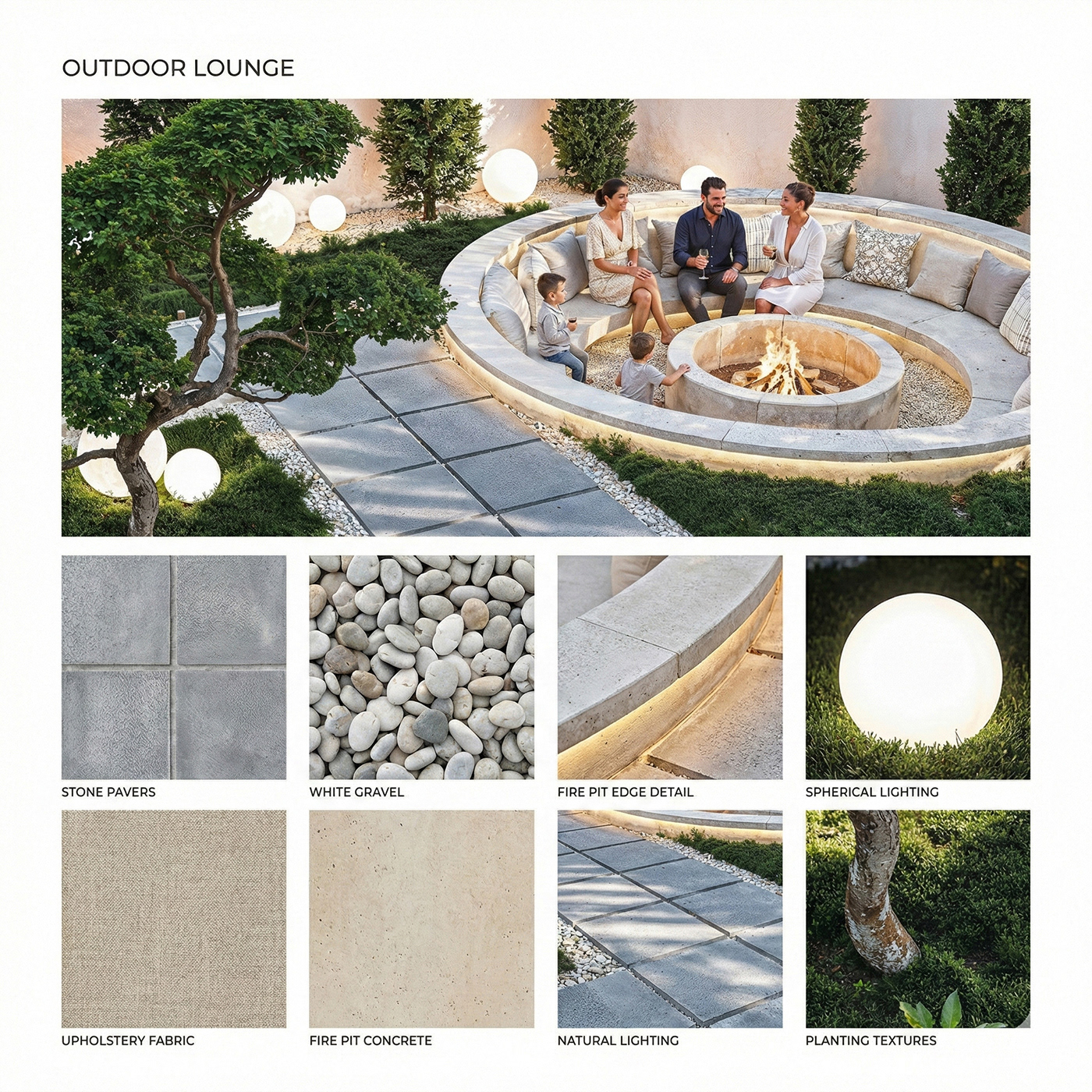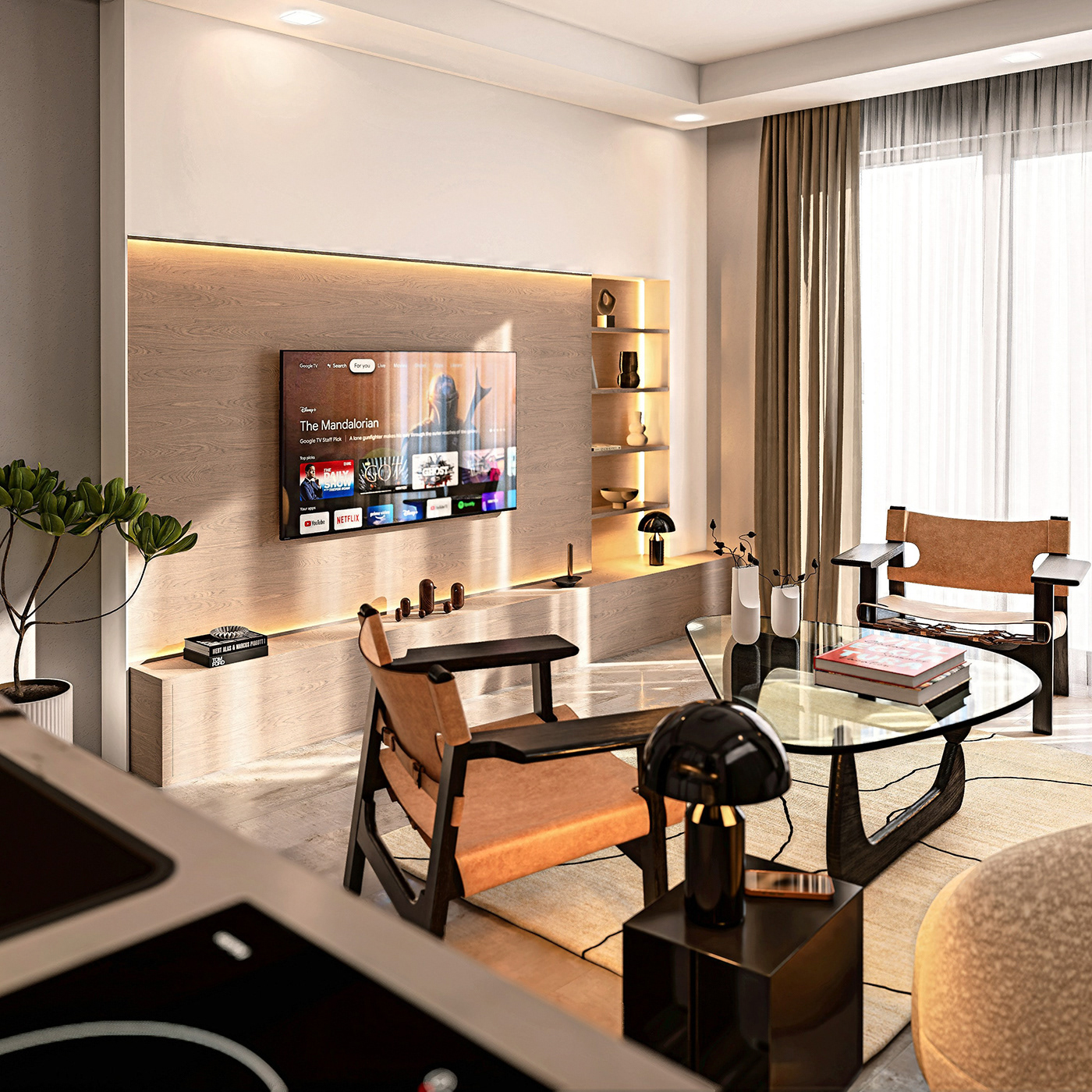 Villa Exterior/Interior Design The project embodies a contemporary architectural language defined by dynamic massing, cantilevered volumes, and a refined interplay of concrete, metal, and wood. Deep eaves with wooden soffits enhance thermal comfort while enriching the facade’s warmth. The landscape blends hardscape and softscape with a sunken fire pit, circular geometry, and subtle night lighting for a cohesive outdoor experience. Interiors feature herringbone wood flooring, slatted wall panels, and iconic furniture selections that emphasize tactile materials such as marble, leather, and bouclé. Concealed lighting and linear fixtures accentuate architectural lines, while the kitchen’s seamless Calacatta surfaces and built-in elements reflect functional elegance. In private spaces, wood–marble combinations, floating vanities, and minimal details create visual harmony, culminating in a spa-like bathroom atmosphere defined by warm lighting and natural stone textures.