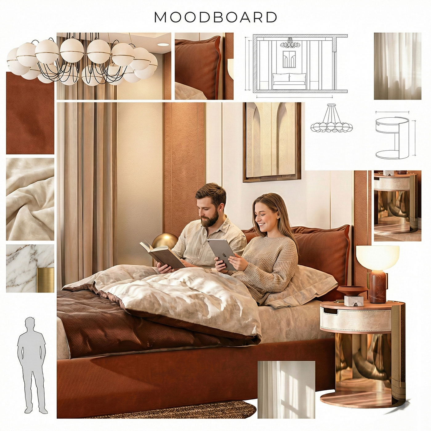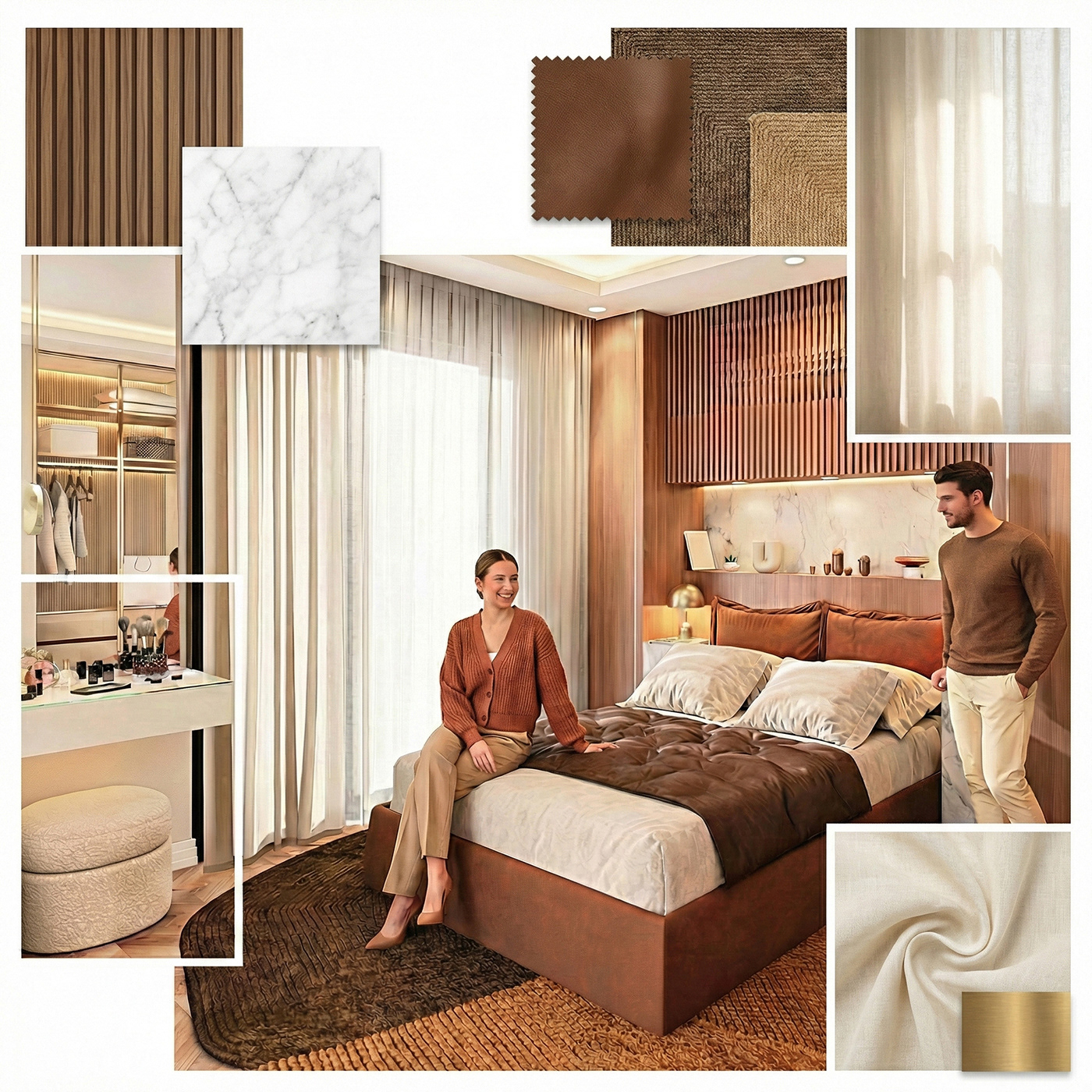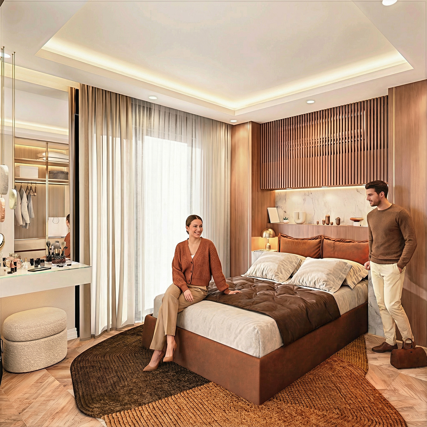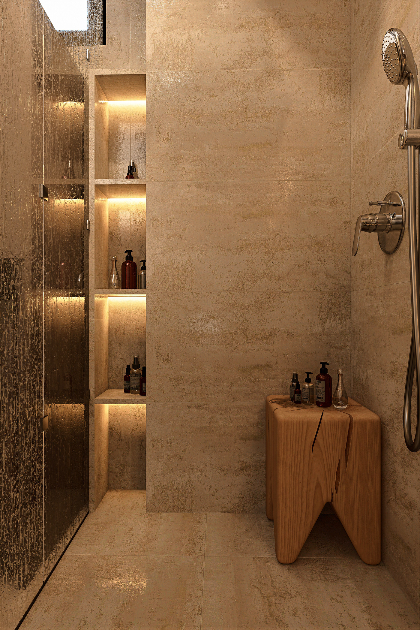 Villa Exterior/Interior Design The project embodies a contemporary architectural language defined by dynamic massing, cantilevered volumes, and a refined interplay of concrete, metal, and wood. Deep eaves with wooden soffits enhance thermal comfort while enriching the facade’s warmth. The landscape blends hardscape and softscape with a sunken fire pit, circular geometry, and subtle night lighting for a cohesive outdoor experience. Interiors feature herringbone wood flooring, slatted wall panels, and iconic furniture selections that emphasize tactile materials such as marble, leather, and bouclé. Concealed lighting and linear fixtures accentuate architectural lines, while the kitchen’s seamless Calacatta surfaces and built-in elements reflect functional elegance. In private spaces, wood–marble combinations, floating vanities, and minimal details create visual harmony, culminating in a spa-like bathroom atmosphere defined by warm lighting and natural stone textures.