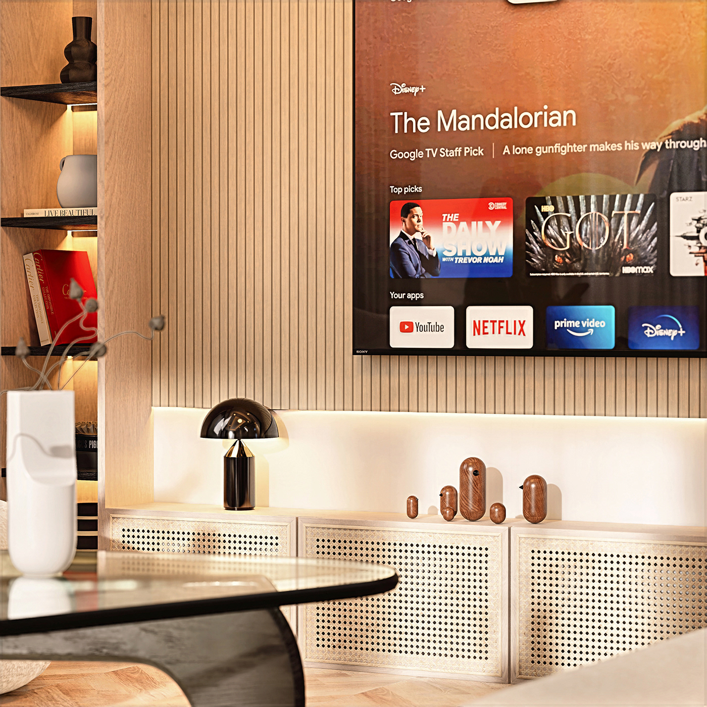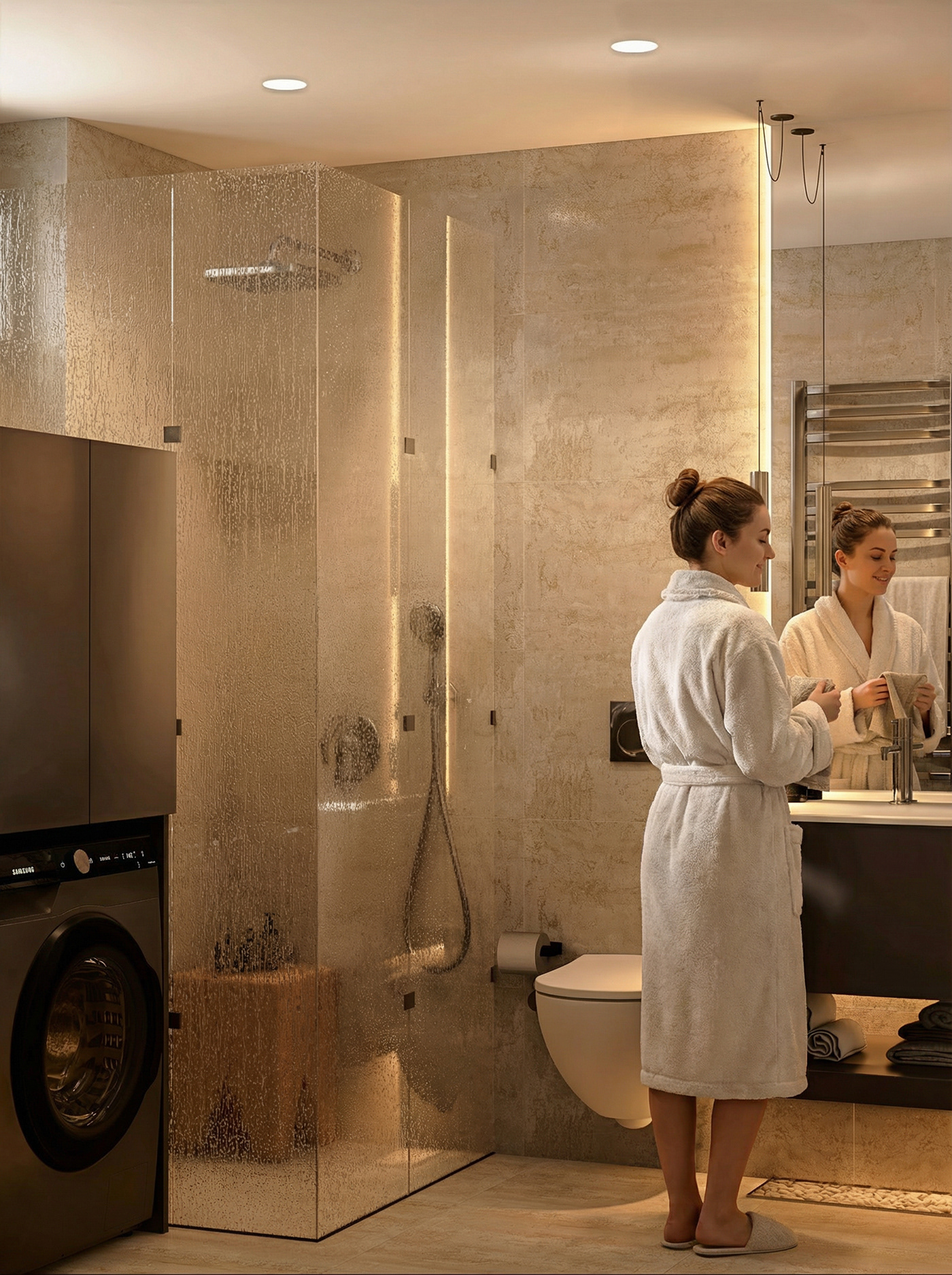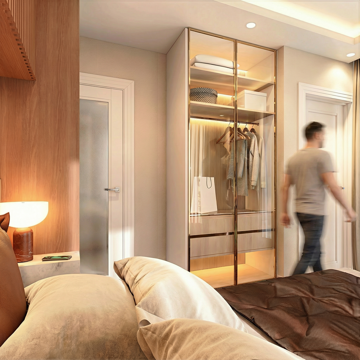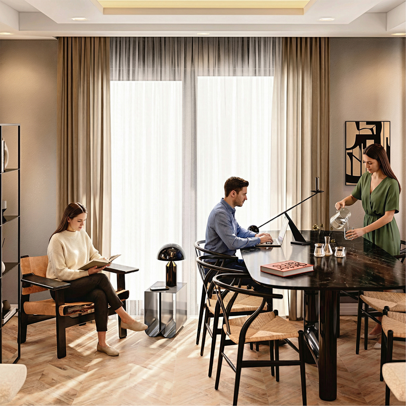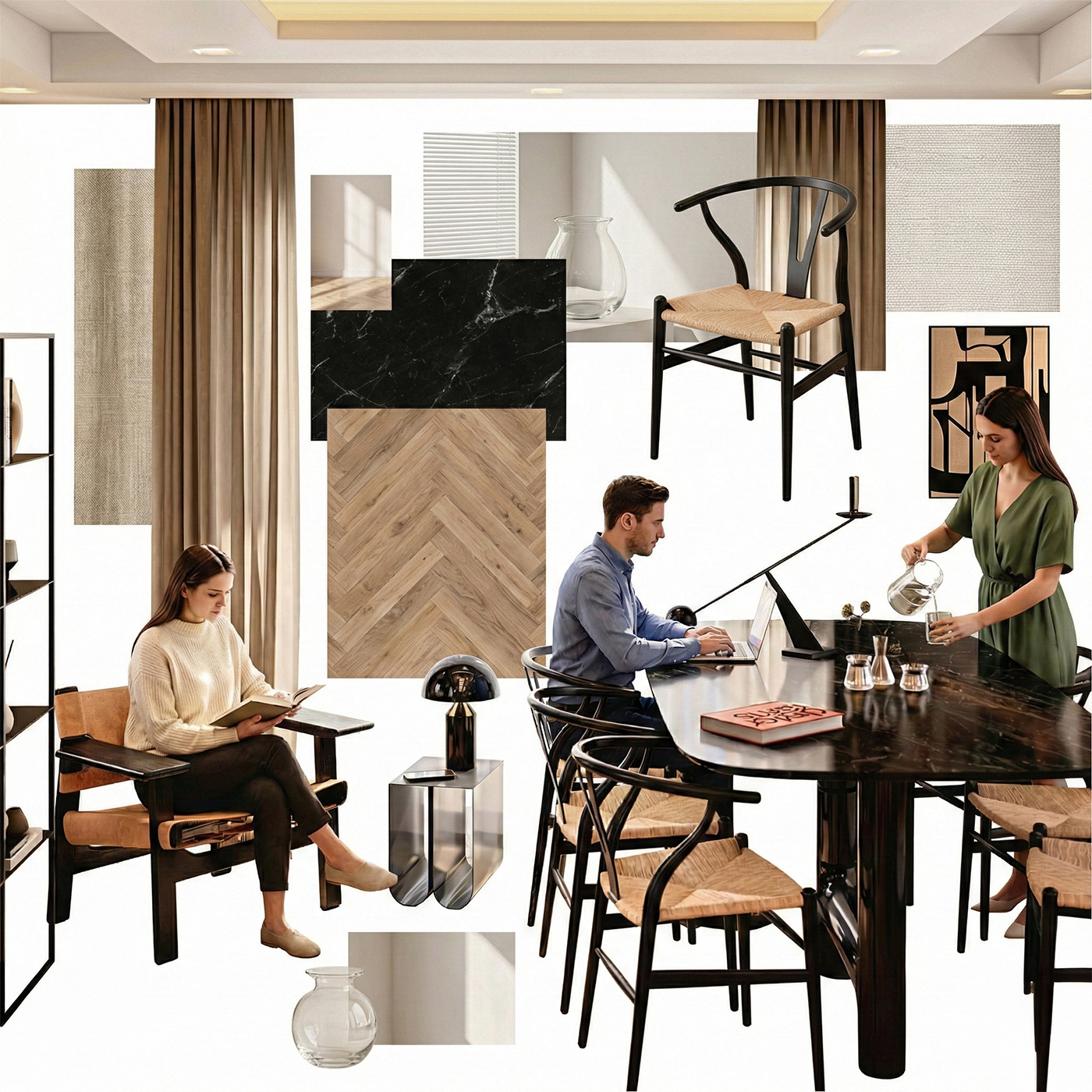 Villa Exterior/Interior Design The project embodies a contemporary architectural language defined by dynamic massing, cantilevered volumes, and a refined interplay of concrete, metal, and wood. Deep eaves with wooden soffits enhance thermal comfort while enriching the facade’s warmth. The landscape blends hardscape and softscape with a sunken fire pit, circular geometry, and subtle night lighting for a cohesive outdoor experience. Interiors feature herringbone wood flooring, slatted wall panels, and iconic furniture selections that emphasize tactile materials such as marble, leather, and bouclé. Concealed lighting and linear fixtures accentuate architectural lines, while the kitchen’s seamless Calacatta surfaces and built-in elements reflect functional elegance. In private spaces, wood–marble combinations, floating vanities, and minimal details create visual harmony, culminating in a spa-like bathroom atmosphere defined by warm lighting and natural stone textures.