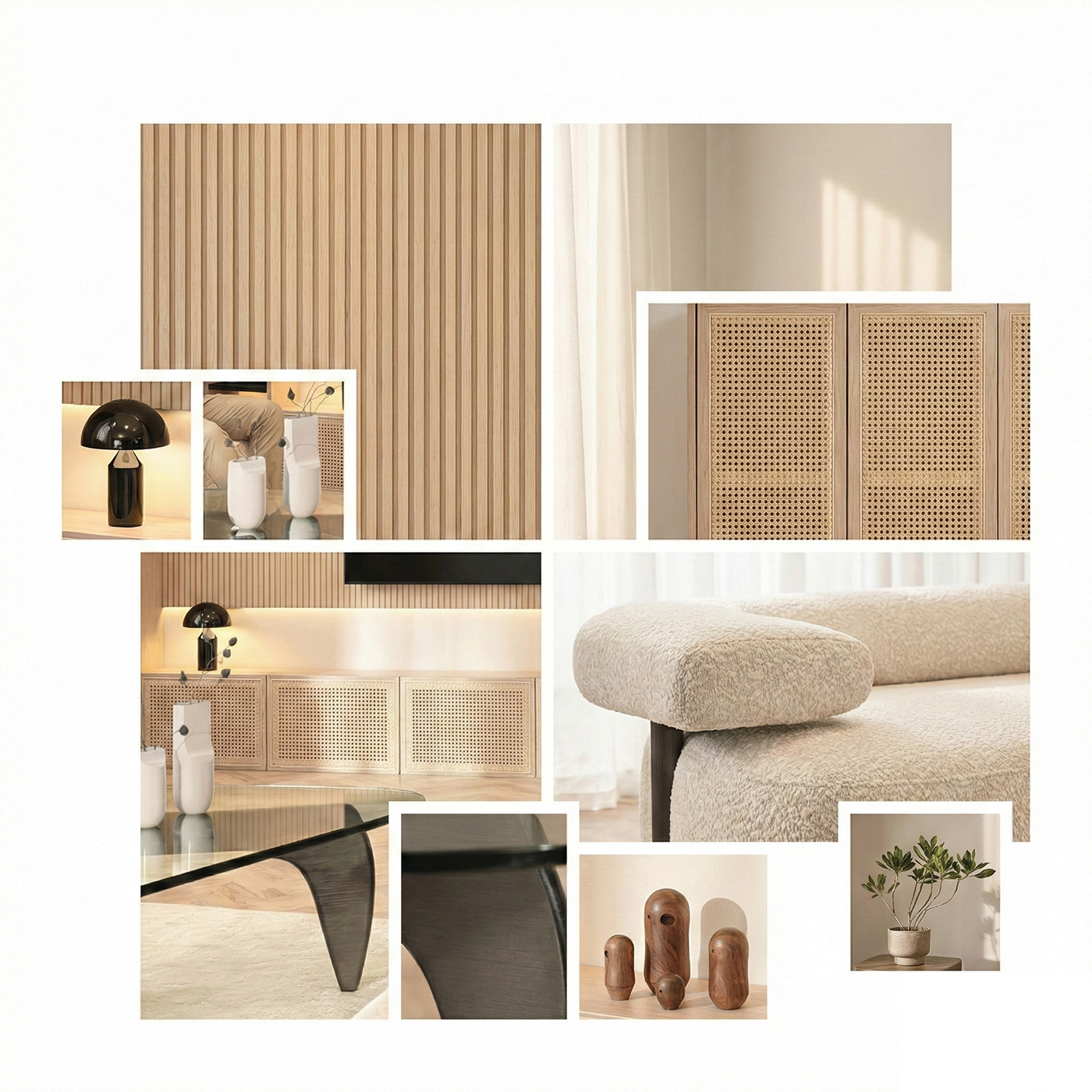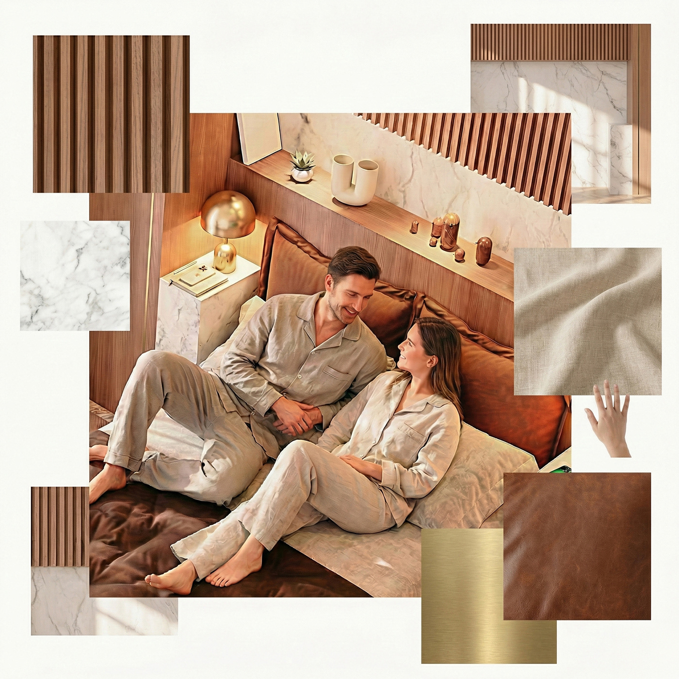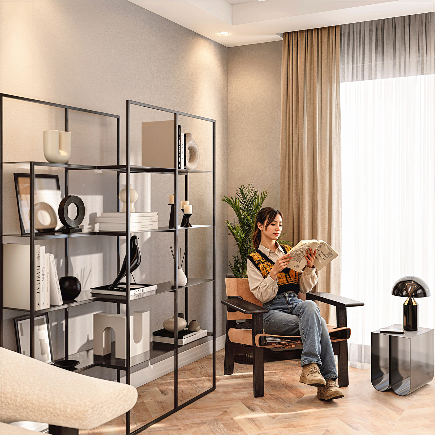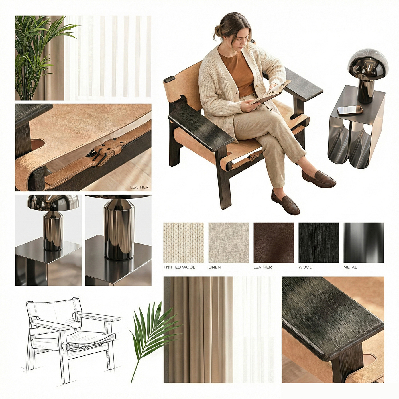 Villa Exterior/Interior Design The project embodies a contemporary architectural language defined by dynamic massing, cantilevered volumes, and a refined interplay of concrete, metal, and wood. Deep eaves with wooden soffits enhance thermal comfort while enriching the facade’s warmth. The landscape blends hardscape and softscape with a sunken fire pit, circular geometry, and subtle night lighting for a cohesive outdoor experience. Interiors feature herringbone wood flooring, slatted wall panels, and iconic furniture selections that emphasize tactile materials such as marble, leather, and bouclé. Concealed lighting and linear fixtures accentuate architectural lines, while the kitchen’s seamless Calacatta surfaces and built-in elements reflect functional elegance. In private spaces, wood–marble combinations, floating vanities, and minimal details create visual harmony, culminating in a spa-like bathroom atmosphere defined by warm lighting and natural stone textures.
