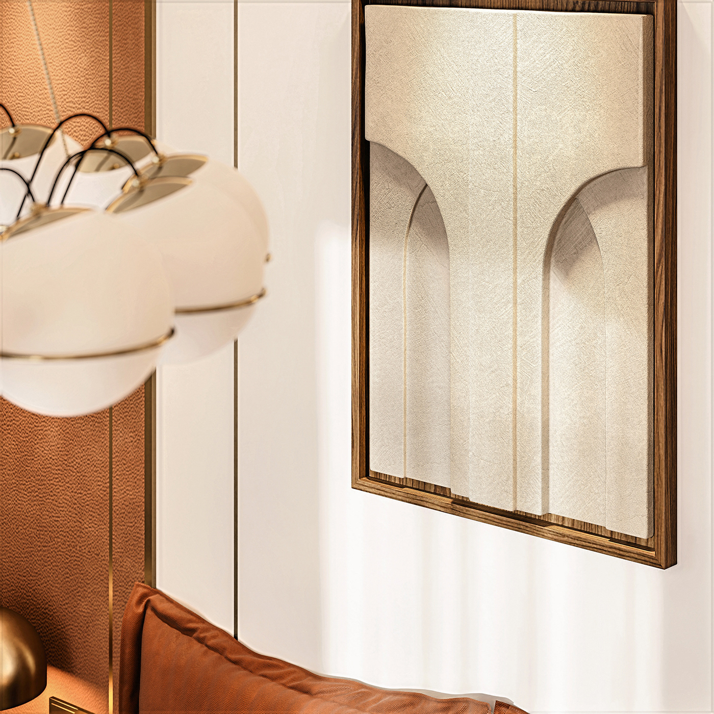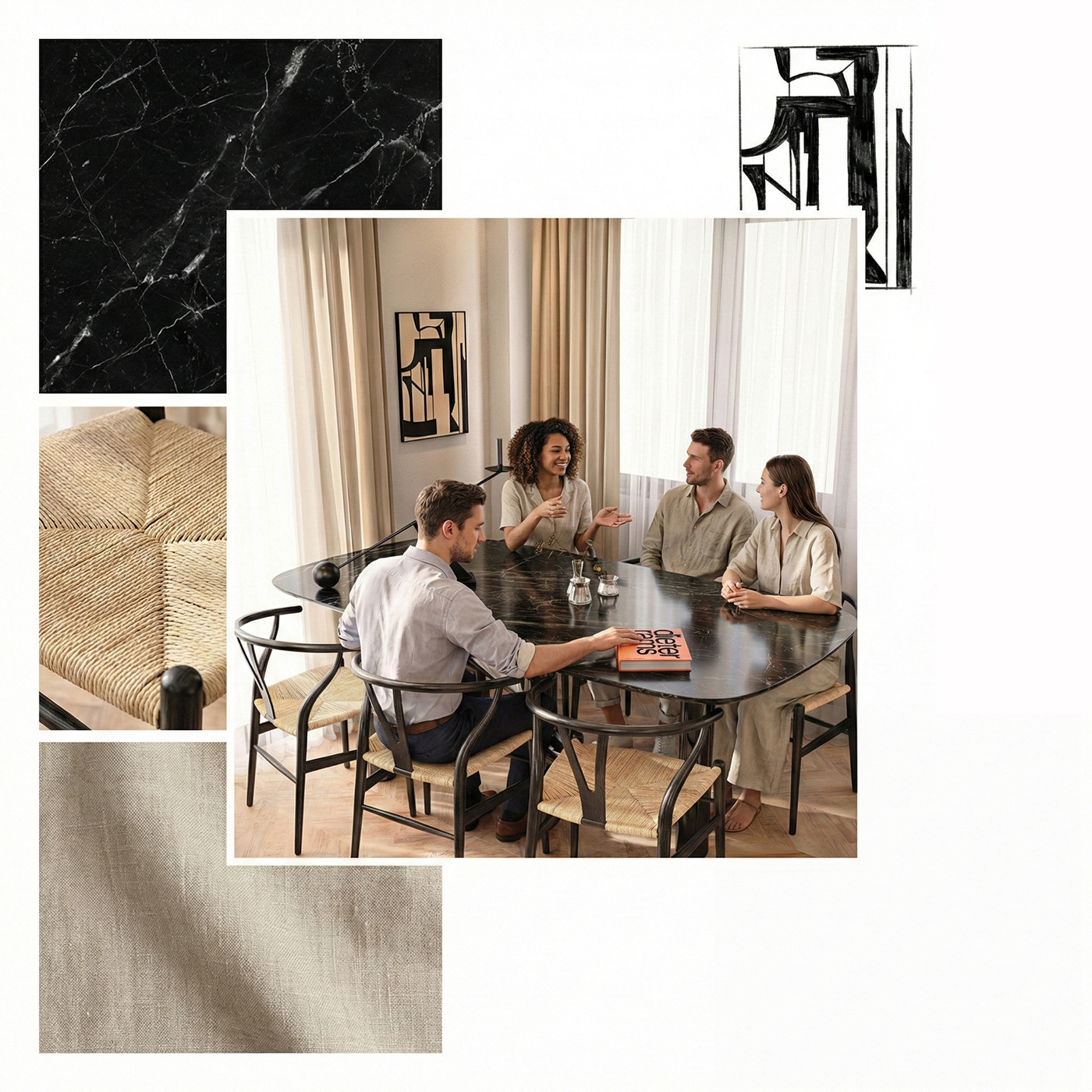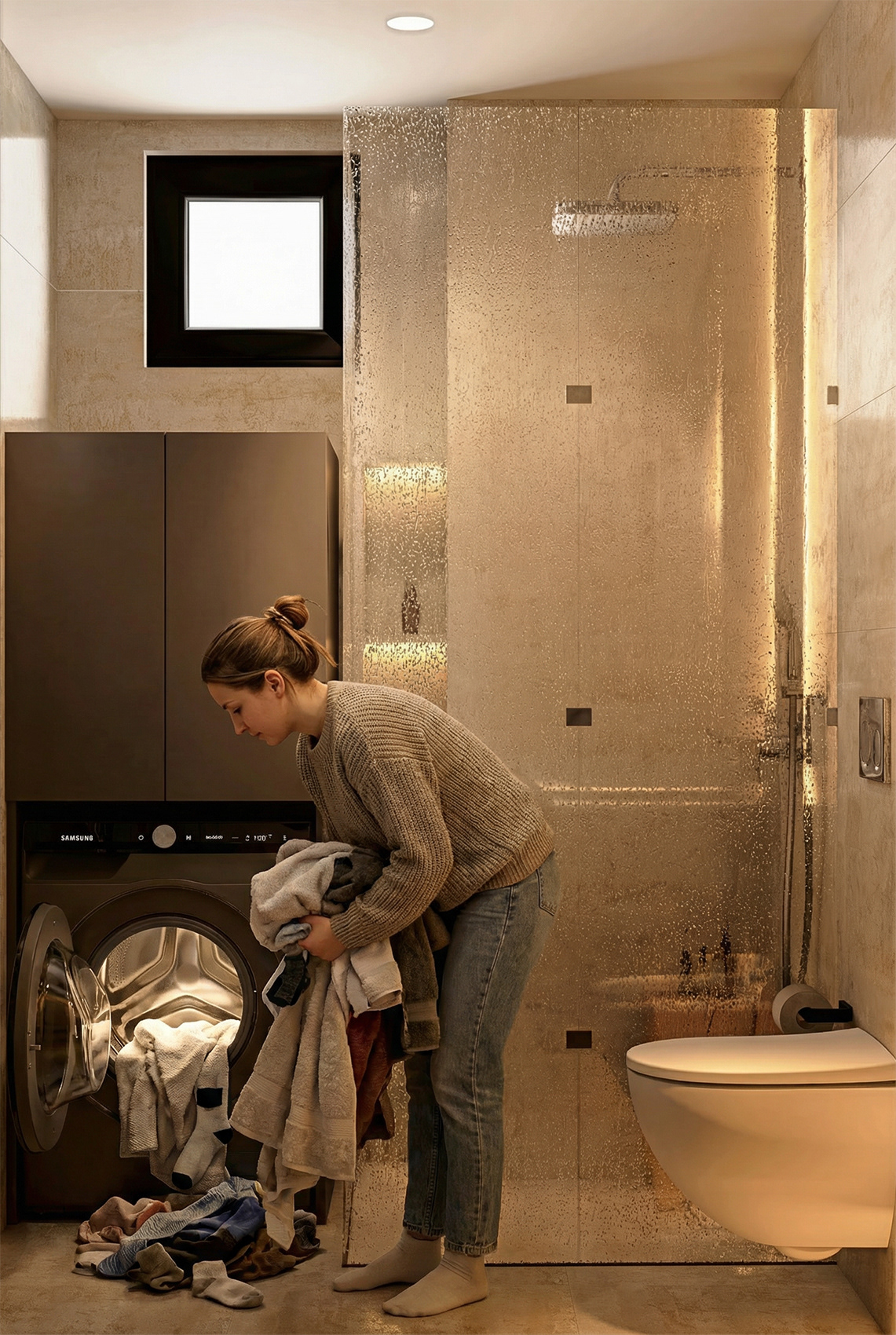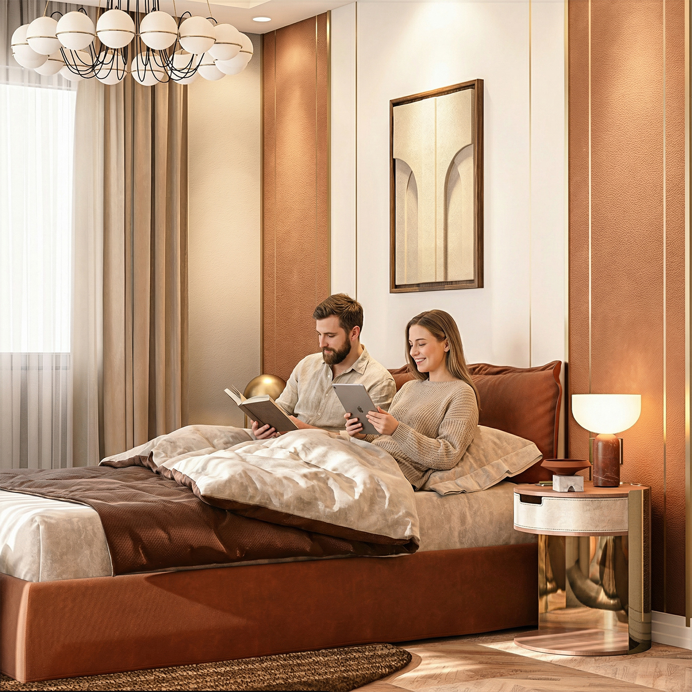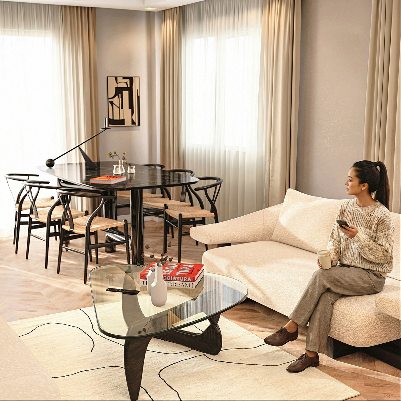 Villa Exterior/Interior Design The project embodies a contemporary architectural language defined by dynamic massing, cantilevered volumes, and a refined interplay of concrete, metal, and wood. Deep eaves with wooden soffits enhance thermal comfort while enriching the facade’s warmth. The landscape blends hardscape and softscape with a sunken fire pit, circular geometry, and subtle night lighting for a cohesive outdoor experience. Interiors feature herringbone wood flooring, slatted wall panels, and iconic furniture selections that emphasize tactile materials such as marble, leather, and bouclé. Concealed lighting and linear fixtures accentuate architectural lines, while the kitchen’s seamless Calacatta surfaces and built-in elements reflect functional elegance. In private spaces, wood–marble combinations, floating vanities, and minimal details create visual harmony, culminating in a spa-like bathroom atmosphere defined by warm lighting and natural stone textures.