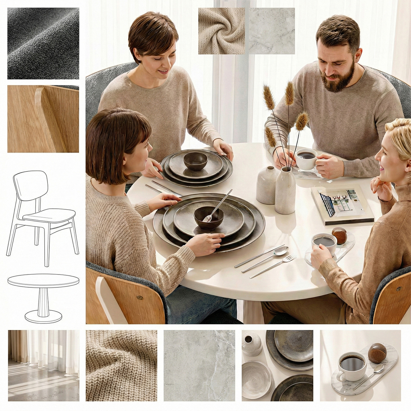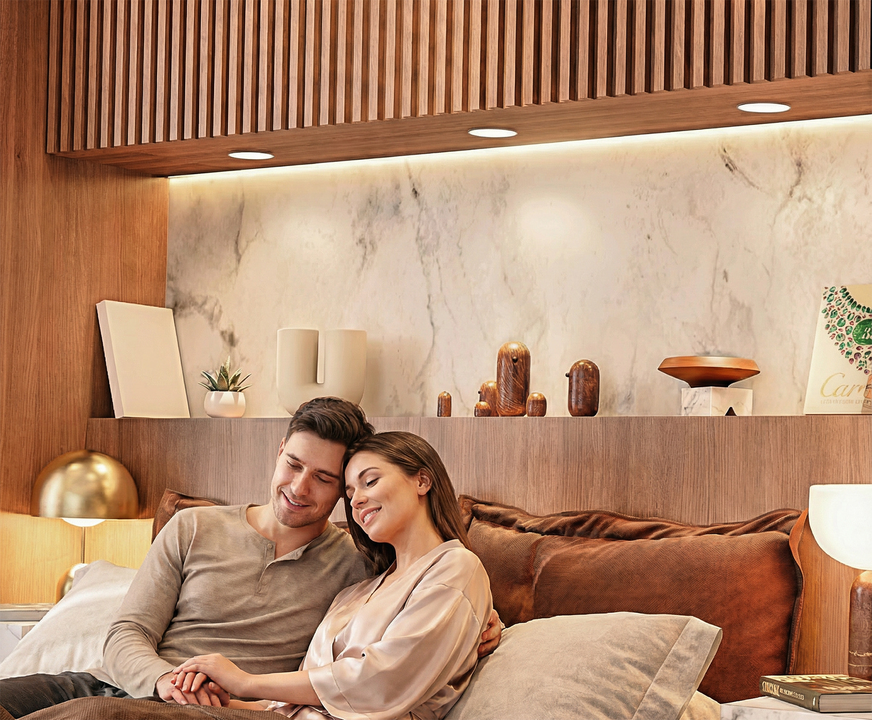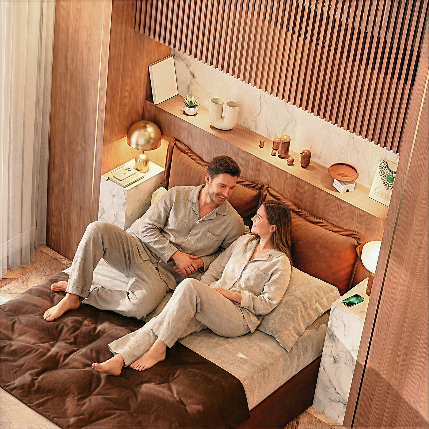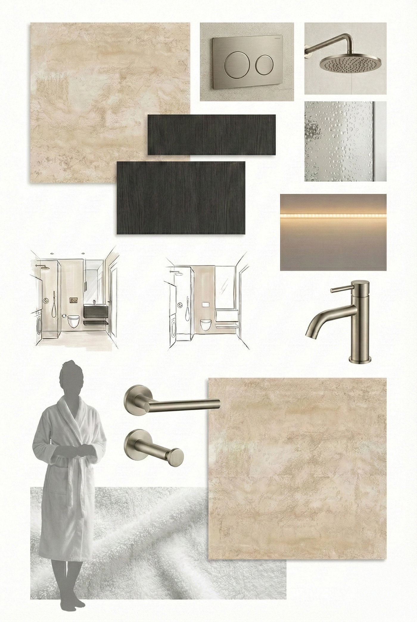 Villa Exterior/Interior Design The project embodies a contemporary architectural language defined by dynamic massing, cantilevered volumes, and a refined interplay of concrete, metal, and wood. Deep eaves with wooden soffits enhance thermal comfort while enriching the facade’s warmth. The landscape blends hardscape and softscape with a sunken fire pit, circular geometry, and subtle night lighting for a cohesive outdoor experience. Interiors feature herringbone wood flooring, slatted wall panels, and iconic furniture selections that emphasize tactile materials such as marble, leather, and bouclé. Concealed lighting and linear fixtures accentuate architectural lines, while the kitchen’s seamless Calacatta surfaces and built-in elements reflect functional elegance. In private spaces, wood–marble combinations, floating vanities, and minimal details create visual harmony, culminating in a spa-like bathroom atmosphere defined by warm lighting and natural stone textures.